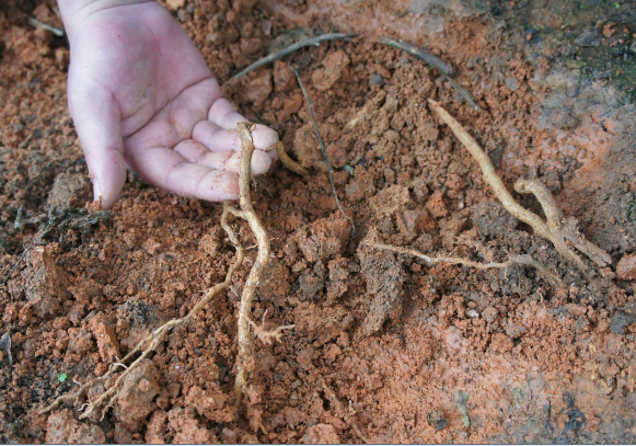 對照組土壤與示范組同屬一個土壤環境,主根系周圍沒有須根,且有根腐現象,淺層土壤10厘米幾乎沒有須根