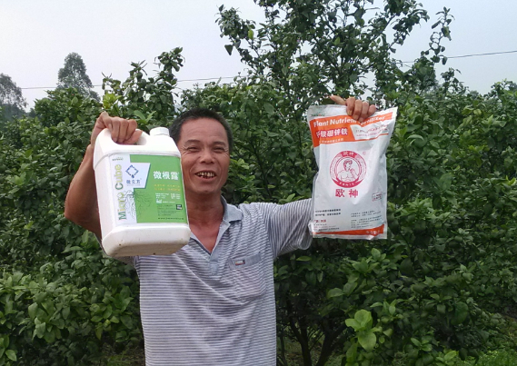 效果:該果農由于管理不當,果樹70%以上黃化,施用很多高端復合肥、水溶性肥和沖施肥都沒能解決,去年沒有產量虧損嚴重。4月初經介紹用微根露加鈣鎂硼鋅鐵套餐進行沖施后,果樹明顯轉綠,掛果量大,根系非常健康發達,果農非常認可和信賴!