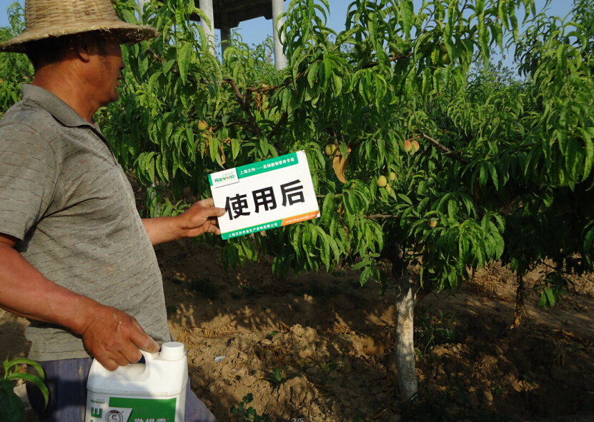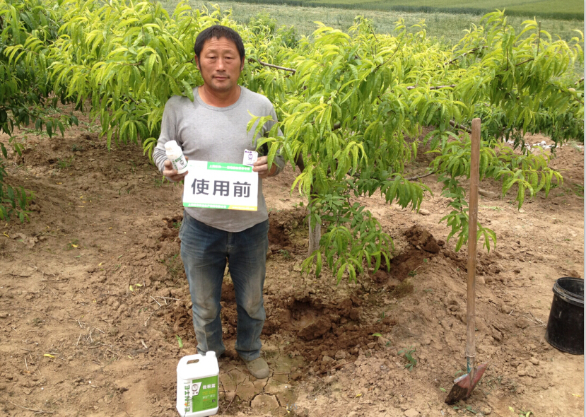 該村露天桃樹面積集中,但是一直有黃化現象,我們感覺這是一次公司產品切入當地市場和大顯身手的時候,所以我們先現場查看情況,診斷病因,然后制定微根露+螯合鐵的灌根方案。