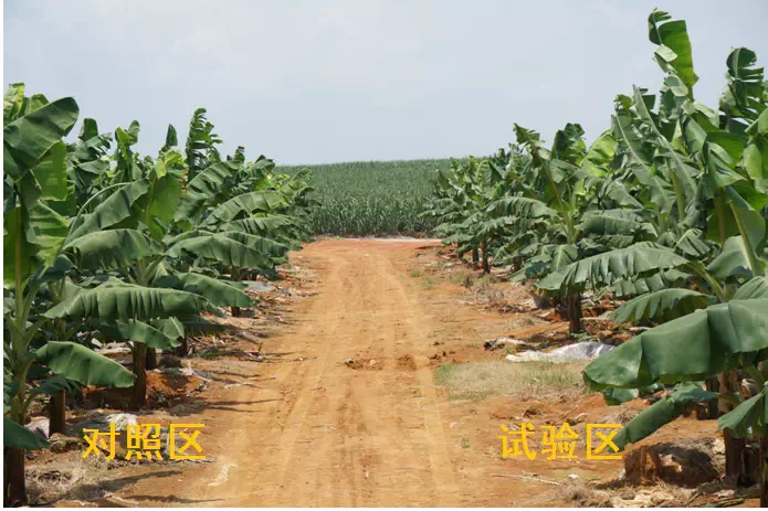 (在南寧武鳴的香蕉基地,原本處于較頹勢的試驗組,施用微根露后,黃葉徹底消除、新葉厚綠有光澤,趕超對照組,整體效果非常明顯)