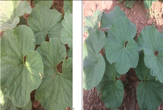 (右邊試驗(yàn)區(qū)的葉片相比左邊對(duì)照區(qū),更濃綠、厚實(shí))