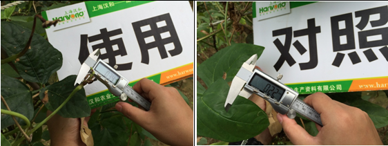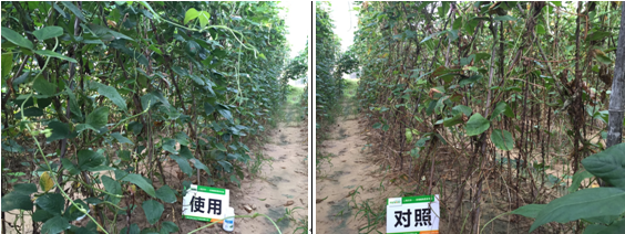 2015年8月3日持續半個月的雨水過后,對照組未使用因卡波的豆角長勢較弱,黃葉落葉較多,使用了因卡波的豆角整體長勢仍然較好,植株下部老葉仍然保持鮮綠,且葉片比未使用的葉片要厚綠。 | |