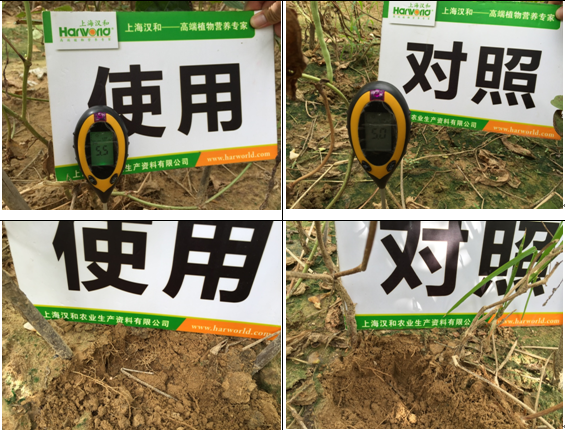 效果說明:使用過微根露的豆角地土壤酸化得到一定的改善,微根露有活土生根的作用,其所含如生化黃腐酸等物質可持續有效調節土壤PH值,促進土壤團粒結構的形成,修復土壤酸化等對根系健康造成的傷害,促使根系強壯發達。 |