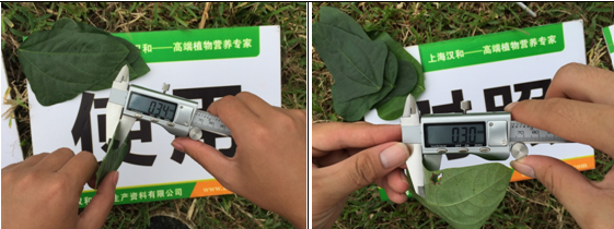 3、葉片厚度: 從對照區與試驗區各取同一部位高度大小相近的5片葉進行測量。 |
