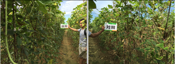 2015年7月19日豆角處于生長旺期,已使用因卡波的豆角長勢較好,整體結的豆角比較均勻。未使用的對照區長勢不差,所結豆角沒有使用因卡波的均勻。 |