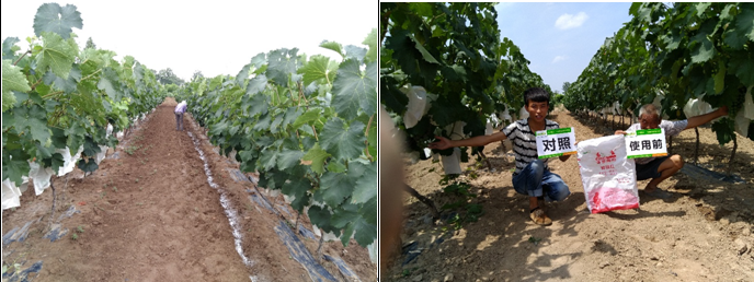 (左為使用前;右為使用普滋紅后。效果說明:在戶太葡萄上使用普滋紅后,葡萄轉(zhuǎn)色速度快,著色均勻。)