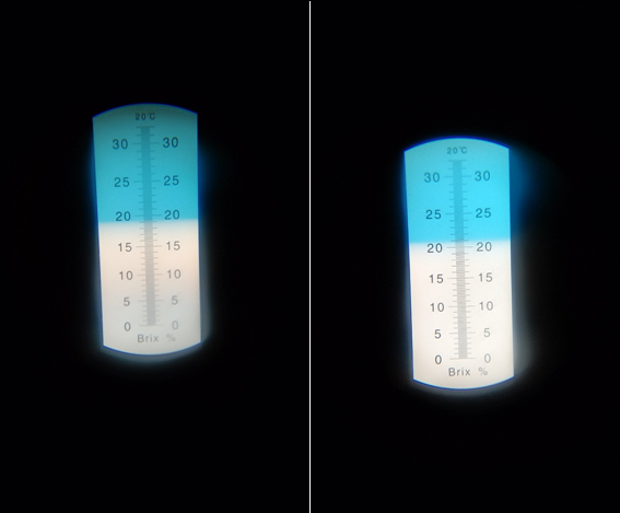 (左為使用其他產(chǎn)品糖度;右為使用普滋紅糖度。效果說明:使用普滋紅的戶太葡萄糖度更高,達到21,而常規(guī)戶太葡萄成熟后糖度在17-19之間。)